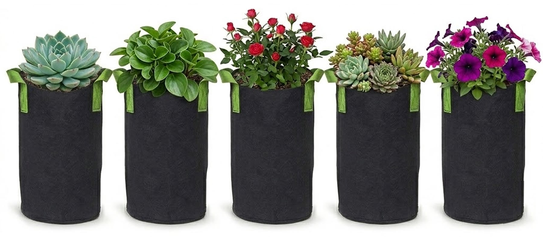Made from high-quality fabric, these pots feature a breathable design that allows air to penetrate the soil, providing vital oxygen to the roots. This promotes healthy root growth and ensures your plants get the necessary nutrients for optimal growth. The black fabric absorbs heat, keeping the soil warm in colder temperatures, while the green handles make it easy to move the pots around.
